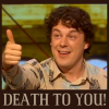 Description: Alan Jones on QI, giving thumbs up, captioned "Death to you!"